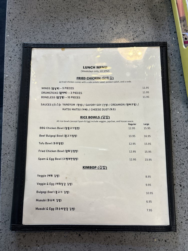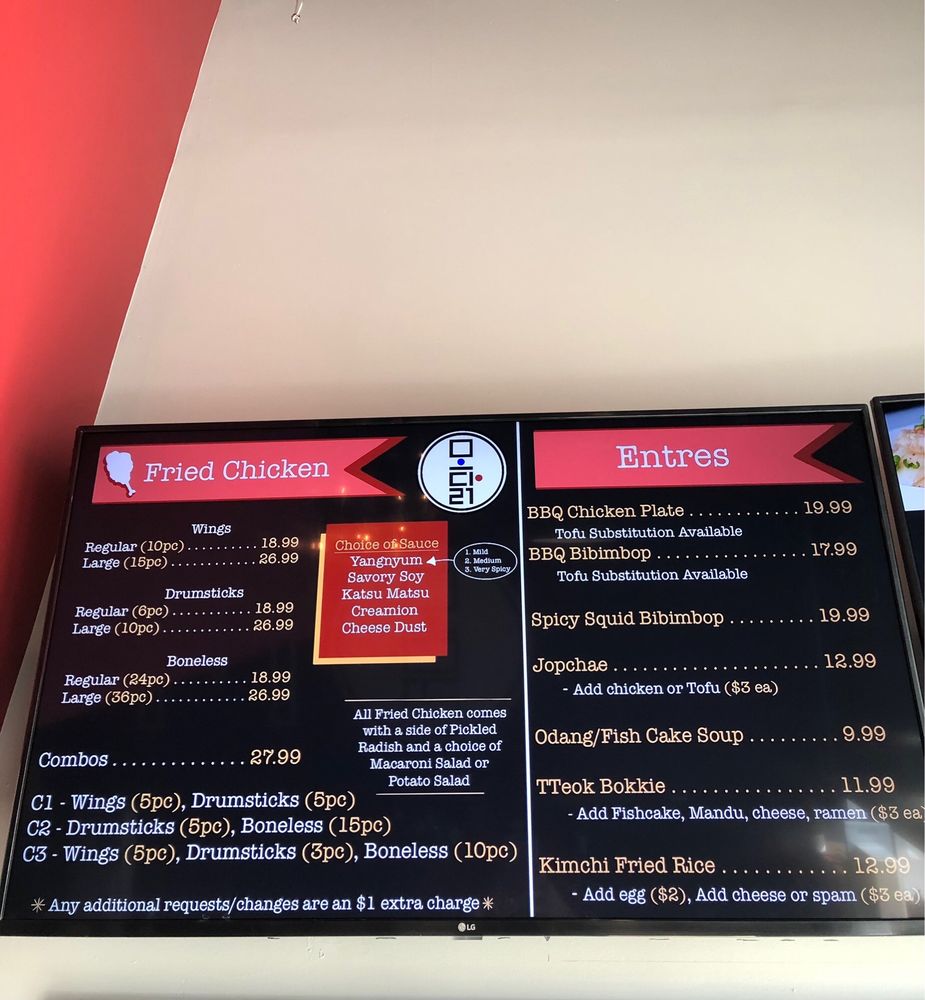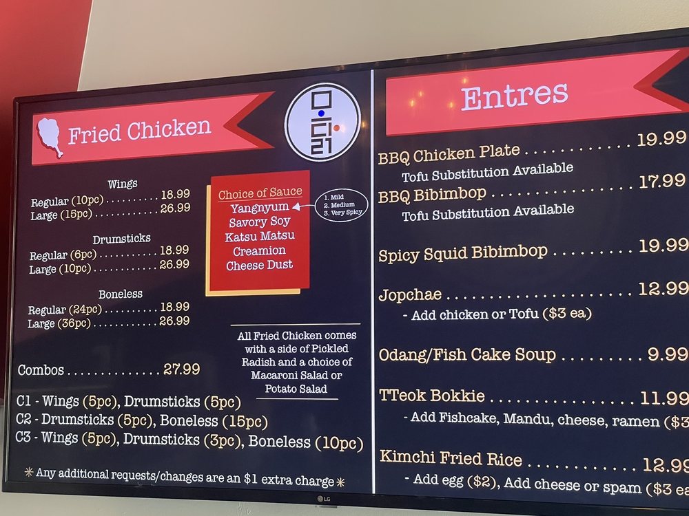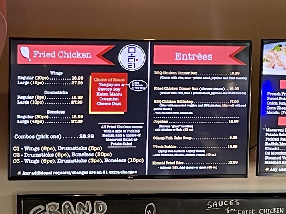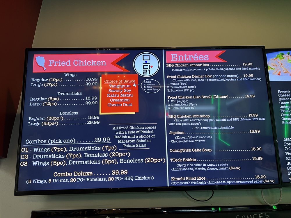 Boneless fried chicken in choice of regular (20 pc) or large (40 pc). Sauce options: yangnyum in four heat levels, savory soy, creamion, katsu matsu, cheese dust, or plain.
